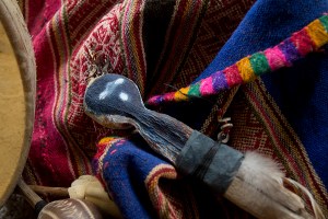Typically, when I start a new project, I try to find or make an image that inspires me during the recording phase of the work. In this case, on a rainy day in the monsoon season of Arizona, I found a rattle made by Judy Derosa of Yosemite, and placed it on a sacred textile that was made in Peru and used for the Despacho ceremony. The Despacho is the shamanic ceremony of the Q’ero, the modern day Inca that is intended to bring balance into one’s life. The image that I made is shown below: